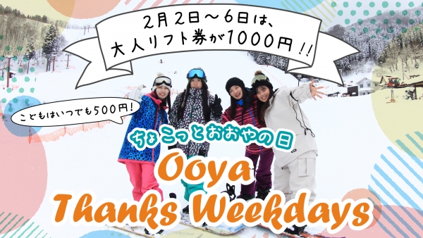 こどもリフト&楽ちんベルト1日券はいつでも500円! さらに、未就学児の楽ちんベルトは無料!! ゲレ近駐車場で、荷物の多いファミリーにも楽ちんなスキー場。 初めてでも、「楽ちんベルト」と「楽ちんレッスン」があるから安心。 楽しく上達することができます。 「楽ちんレッスン」は1時間2000円のお手軽レッスン。 お子様に寄り添ったレッスンで、みんなの雪デビューを応援します。 『初めて』に優しい☆ 『初めて』でも楽しい♪ 『おおやスキー場』でお待ちしています。