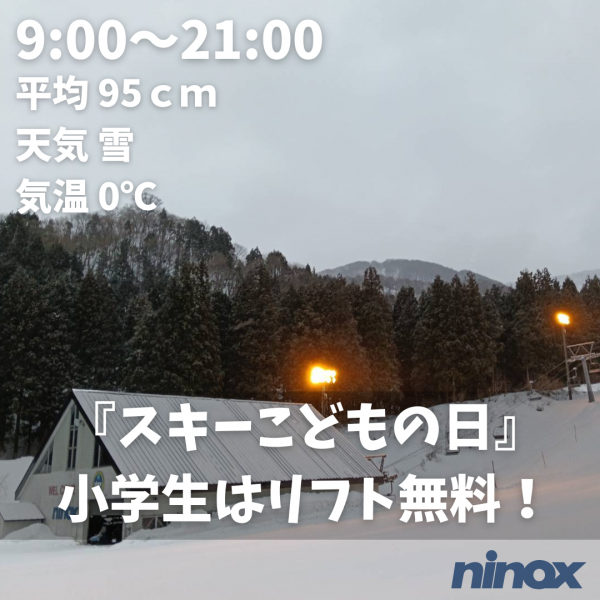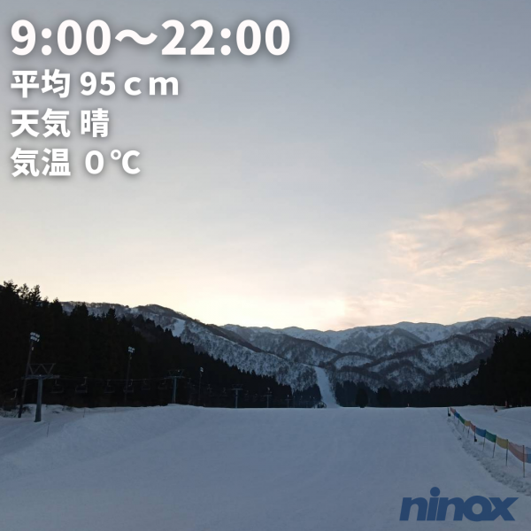 [平日] 09時00分~17時00分 [休日] 09時00分~17時00分 [ナイター] 16時00分~22時00分 [日中営業](予定)2025/12/18~2026/3/22 9:00~17:00 [ナイター営業](予定)2025/12/19~2026/3/15 16:00~21:00(22:00) ※毎週金・土曜日・1/11・2/22は22時まで。 ※上記以外の日曜日・祝日・12/29・12/30・1/1は21時まで。 ※ナイターの営業リフトは第1クワッドリフトとペアリフトとなります。 ※未就学児は保護者同伴でリフト無料。 |