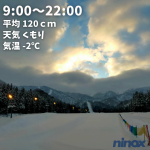 | 滑走状況 | 全面可能[◎] | 天気 | 曇 | 気温 | -2℃ | 雪質 | 圧雪 | 積雪 | 120cm |