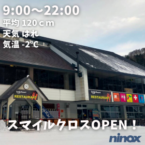 | 滑走状況 | 全面可能[◎] | 天気 | 快晴 | 気温 | -2℃ | 雪質 | 圧雪 | 積雪 | 120cm |