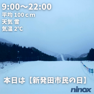 | 滑走状況 | 全面可能[◎] | 天気 | 小雪 | 気温 | 2℃ | 雪質 | 圧雪 | 積雪 | 100cm |